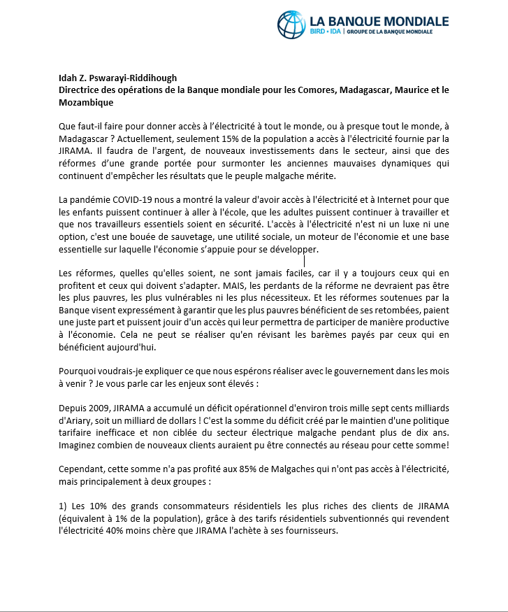 Il est important de bien comprendre et de ne pas déformer notre objectif de changer cette dynamique. Il ne s’agit pas de retirer le pouvoir à certains et de le donner à d’autres. Notre objectif est d’assurer une électricité suffisante pour tous en veillant à ce que les tarifs tiennent compte de (i) la capacité de payer des clients, en particulier des plus vulnérables ; (ii) permettent à la JIRAMA d’entrer dans une trajectoire lui permettant de retrouver son équilibre financier dans un délai de 3 à 4 ans.