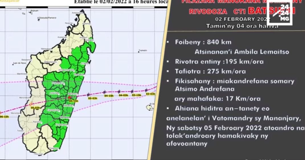 – TOETRANDRO : Hiditra an-tanety eo anelanelan’i Vatomandry sy Mananjary ny Sabotsy 5 Febroary izao ny rivo-doza Batsirai izay hahery vaika ny tanjany