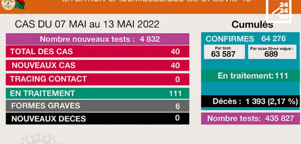– VALANARETINA – Tranga vaovaon’ny covid-19 miisa 40 no voamarina nanomboka ny 7 hatramin’ny 13 Mey, tsy nisy ny aina nafoy.